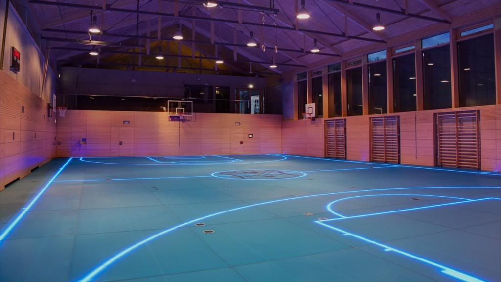 Um piso de vidro num pavilhão de uma escola na Alemanha usa um sistema de leds escondido que permite trocar as marcações apenas com um toque num botão.